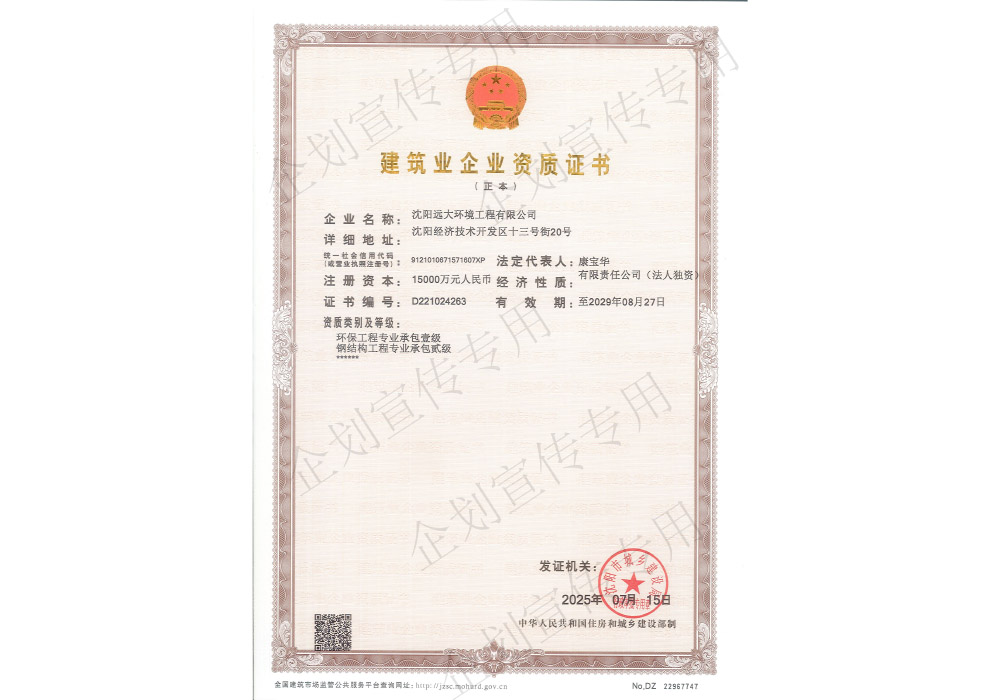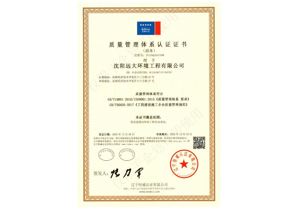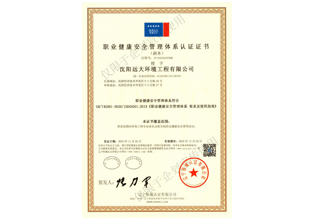 资质荣誉 公司拥有国家住房和城乡建设部颁发的环境工程大气污染防治工程专项甲级设计资质,辽宁省住房和城乡建设厅颁发的环境工程水污染防治工程、固体废物处理处置工程专项乙级设计资质,辽宁省住房和城乡建设厅颁发的环保工程专项总承包一级资质及各类设施运营资质,国家环境保护部颁发的环境污染治理设施除尘、脱硫、脱硝运营资质。2002年通过了ISO9001质量管理体系认证,2010年通过了ISO14001: 2004 环境管理体系和OHSAS 18002:2000职业健康安全管理体系认证。