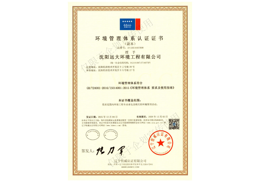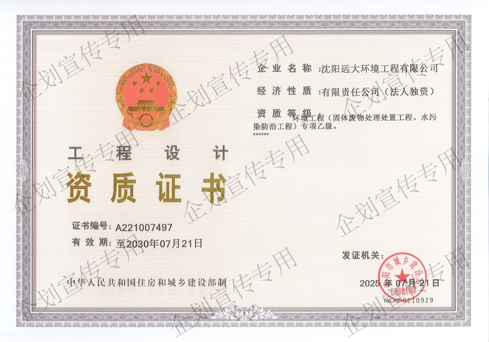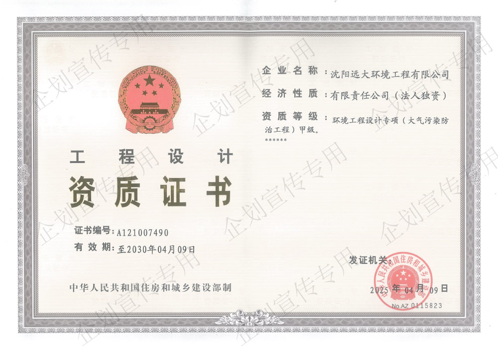 资质荣誉 公司拥有国家住房和城乡建设部颁发的环境工程大气污染防治工程专项甲级设计资质,辽宁省住房和城乡建设厅颁发的环境工程水污染防治工程、固体废物处理处置工程专项乙级设计资质,辽宁省住房和城乡建设厅颁发的环保工程专项总承包一级资质及各类设施运营资质,国家环境保护部颁发的环境污染治理设施除尘、脱硫、脱硝运营资质。2002年通过了ISO9001质量管理体系认证,2010年通过了ISO14001: 2004 环境管理体系和OHSAS 18002:2000职业健康安全管理体系认证。
